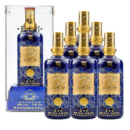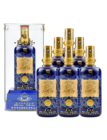 藍七彩30年,西鳳酒主導的重點大單品之一,是奠定次高端白酒市場的形象產品。高級質感透明亞克力材質外盒,瓶身呈現藍寶石般色澤,配以鎏金圖案紋理,天香牡丹金線勾邊花紋環繞,華貴典雅、寓意吉祥。瓶體設計挺拔通直,曲線圓弧有度。極具收藏觀賞性。采用30年酒海陳釀作為基酒勾調,厚重感陳年鳳香。
