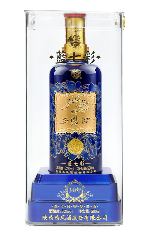藍七彩30年,西鳳酒主導的重點大單品之一,是奠定次高端白酒市場的形象產品。